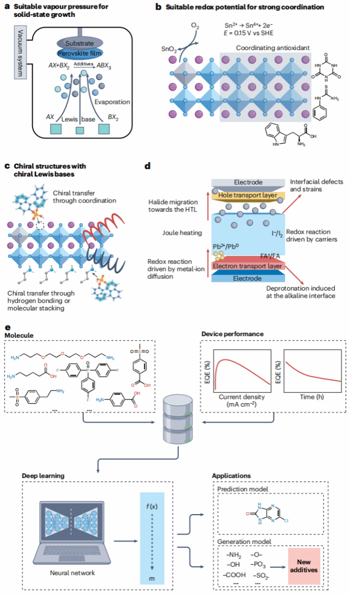 基于路易斯碱性添加剂提高PeLED性能的基本原理,其应用现已拓展到多个新兴的前沿领域。定制化的分子策略正日益针对真空沉积、无铅成分和手性或自旋极化功能的具体需求进行优化,共同建立了一个多功能平台,以实现新型器件功能。